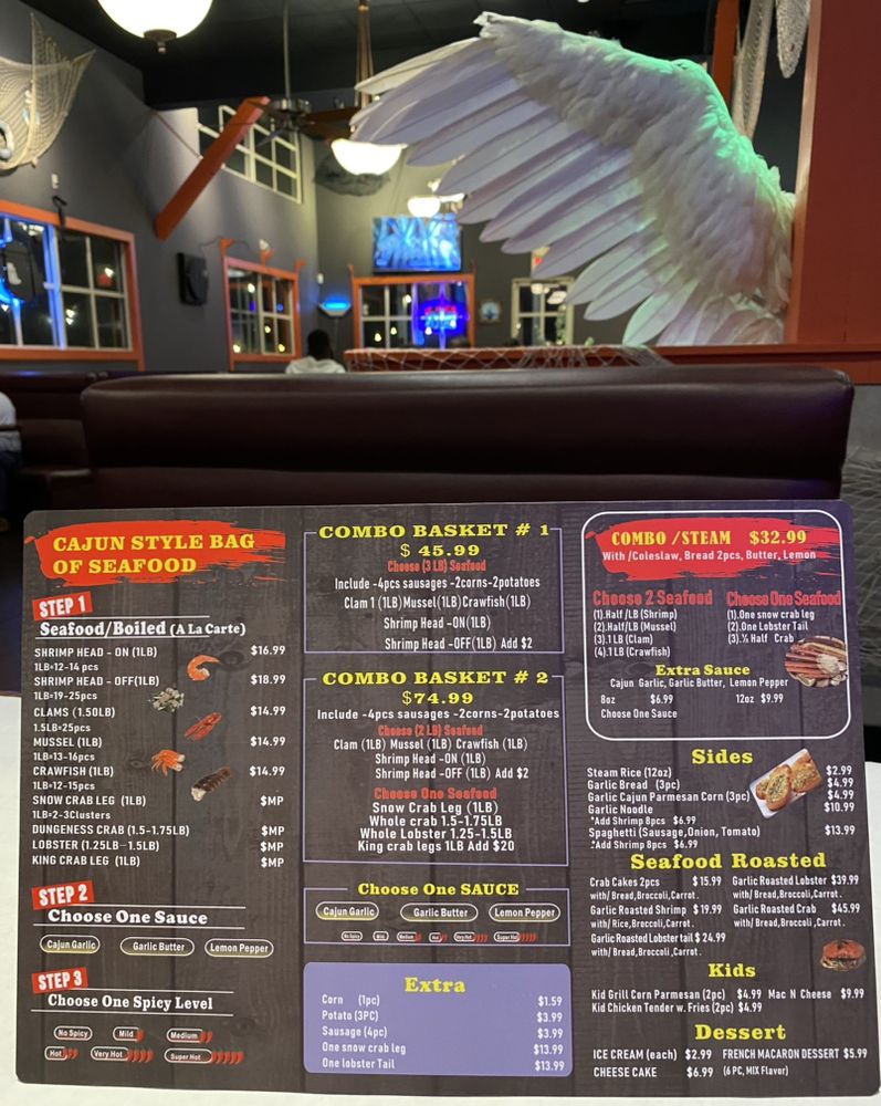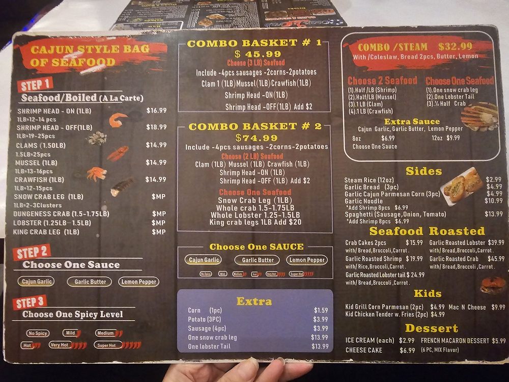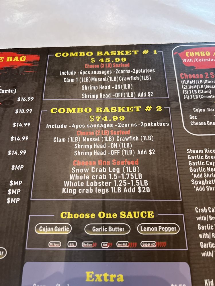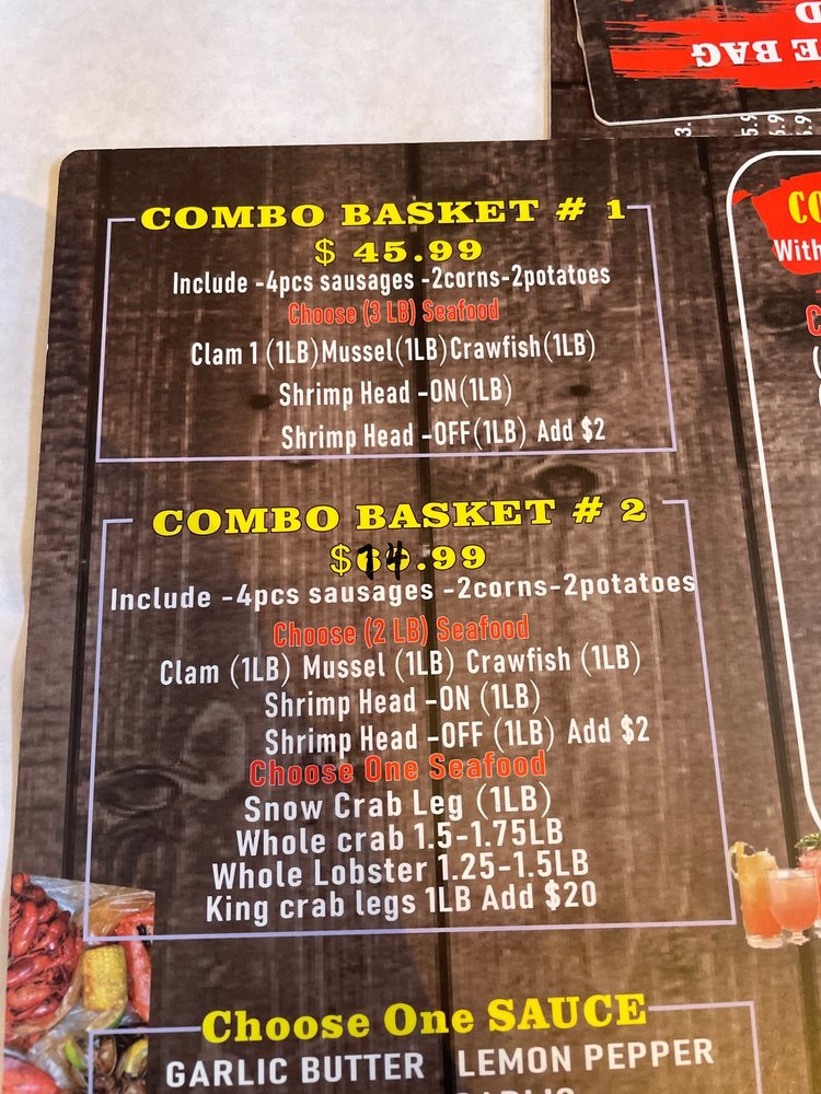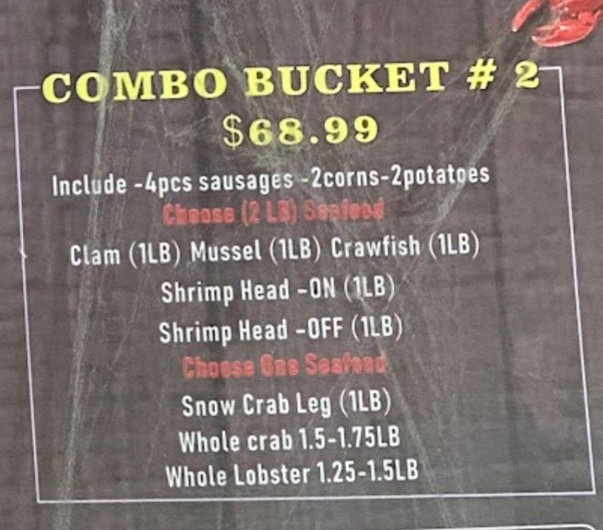 Include - 4 pieces sausage, 2 corns, 2 potatoes. Choose (3 lb.) seafood, Clam 1 (1 lb.), Mussel (1 lb.), Crawfish (1 lb.). Shrimp head-on (1 lb.), Shrimp head-off (1 lb.).
